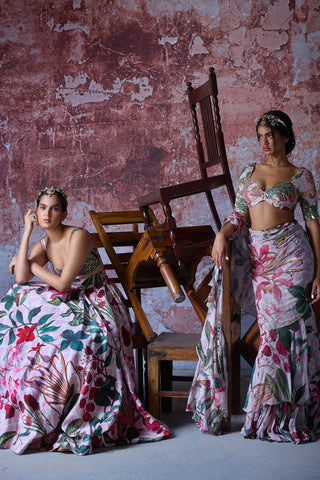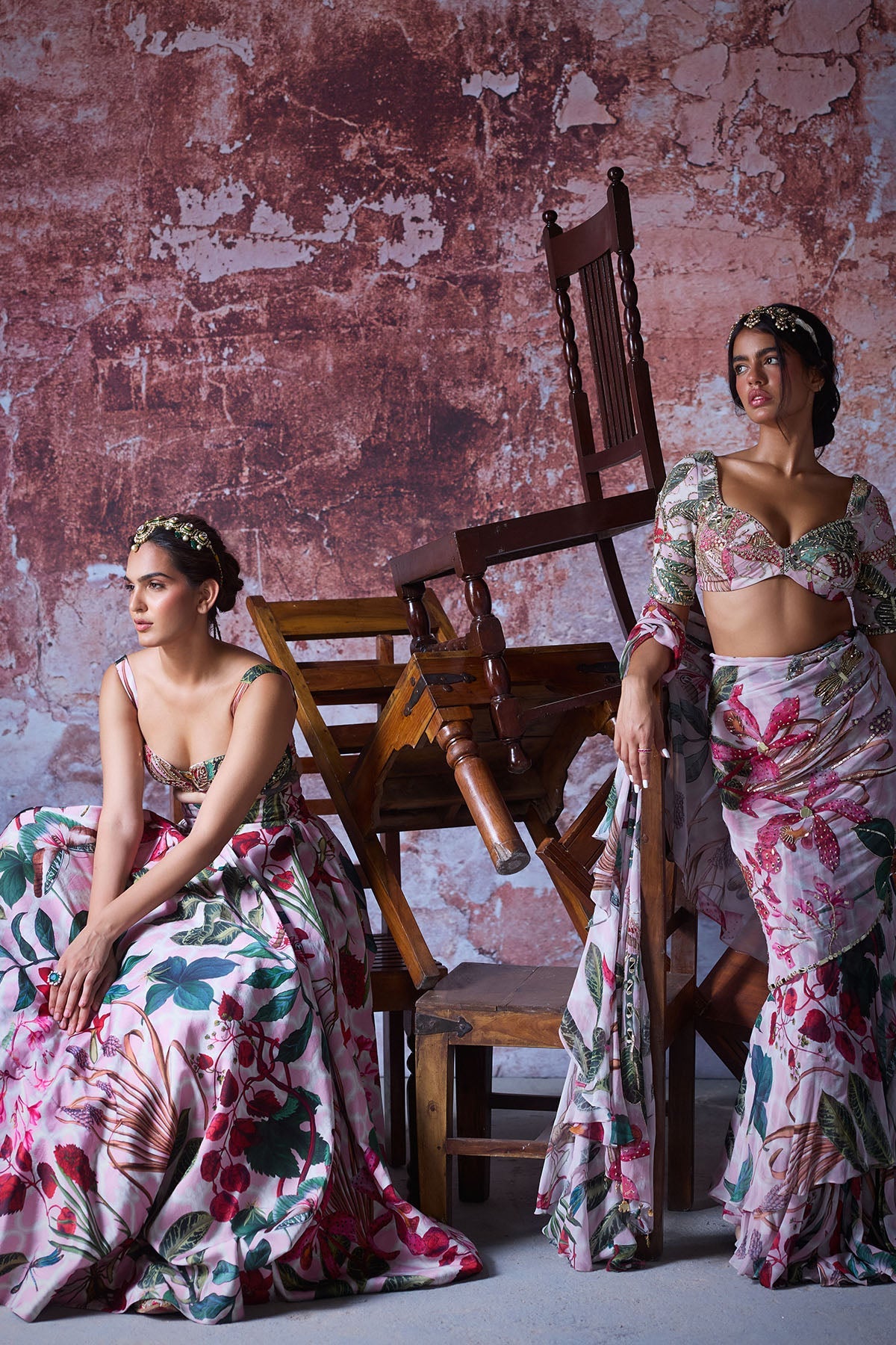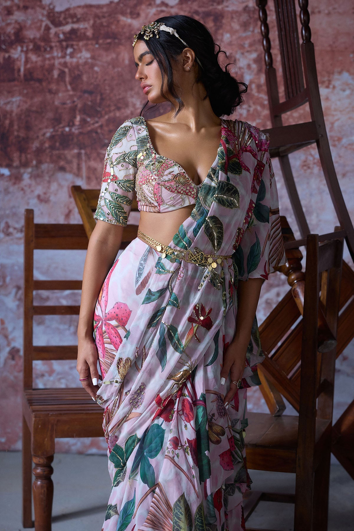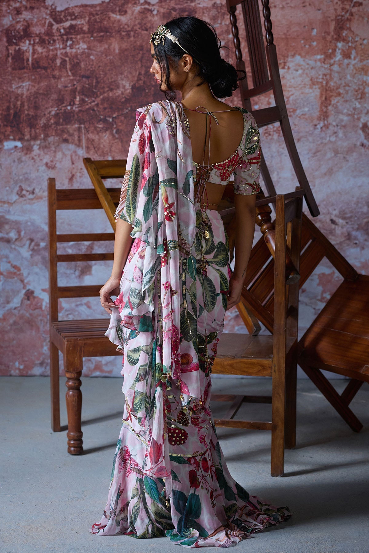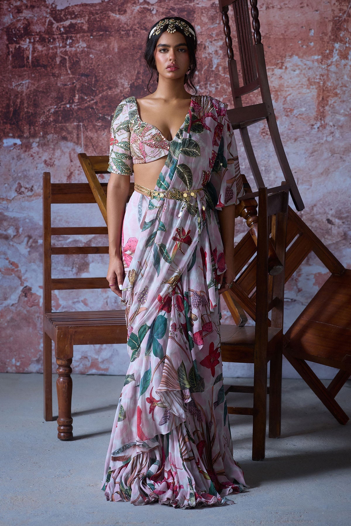 EMBROIDERED RUFFLED SAREE WITH EMBROIDERED BLOUSE AND SIGNATURE MM CHAIN BELT