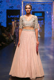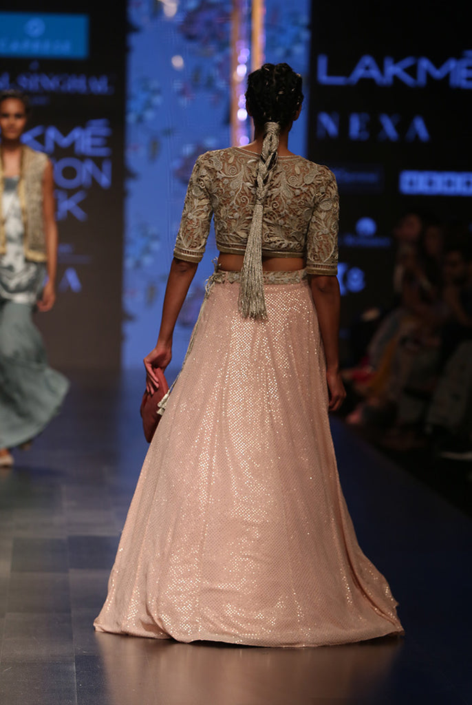Designer Payal Singhal: Dusky rose Organza cutwork embroidered choli with mukaish georgette lehenga and cutwork belt