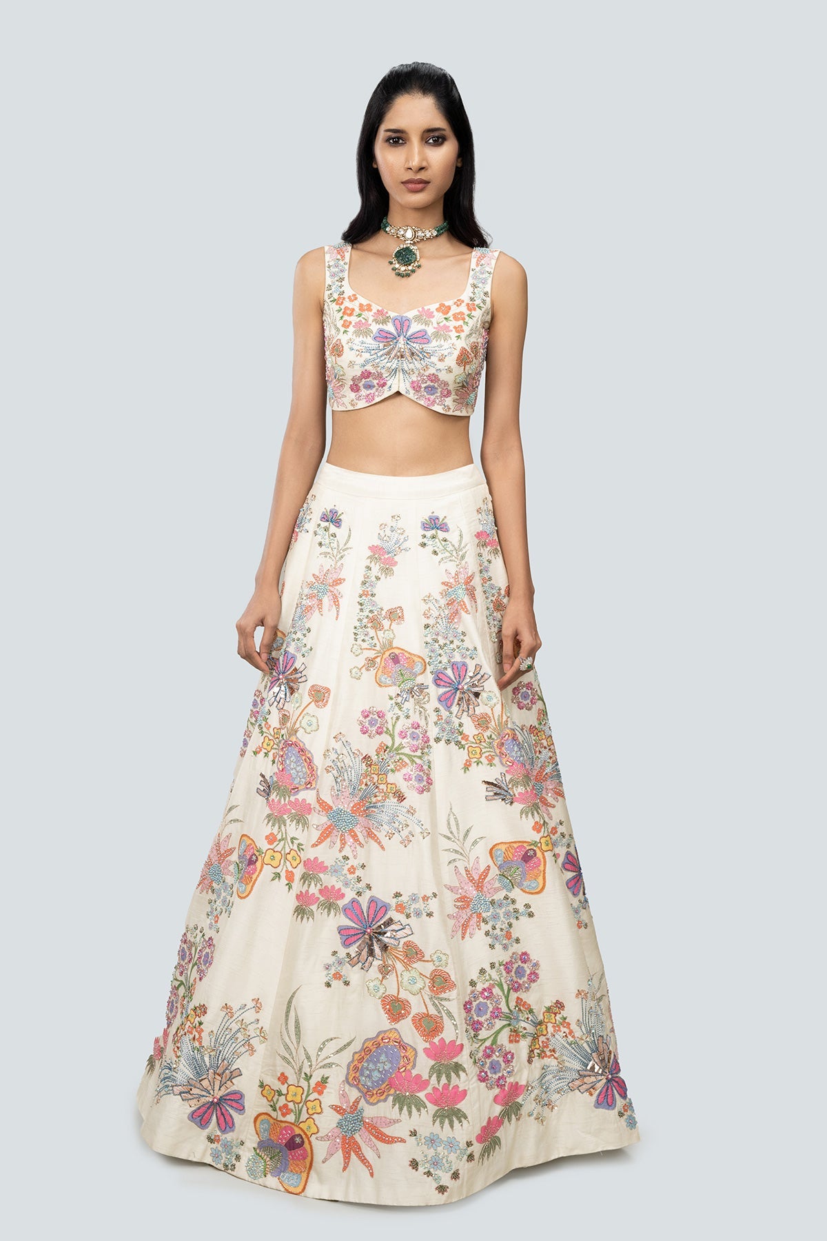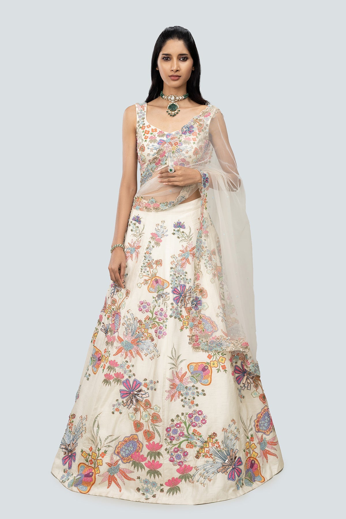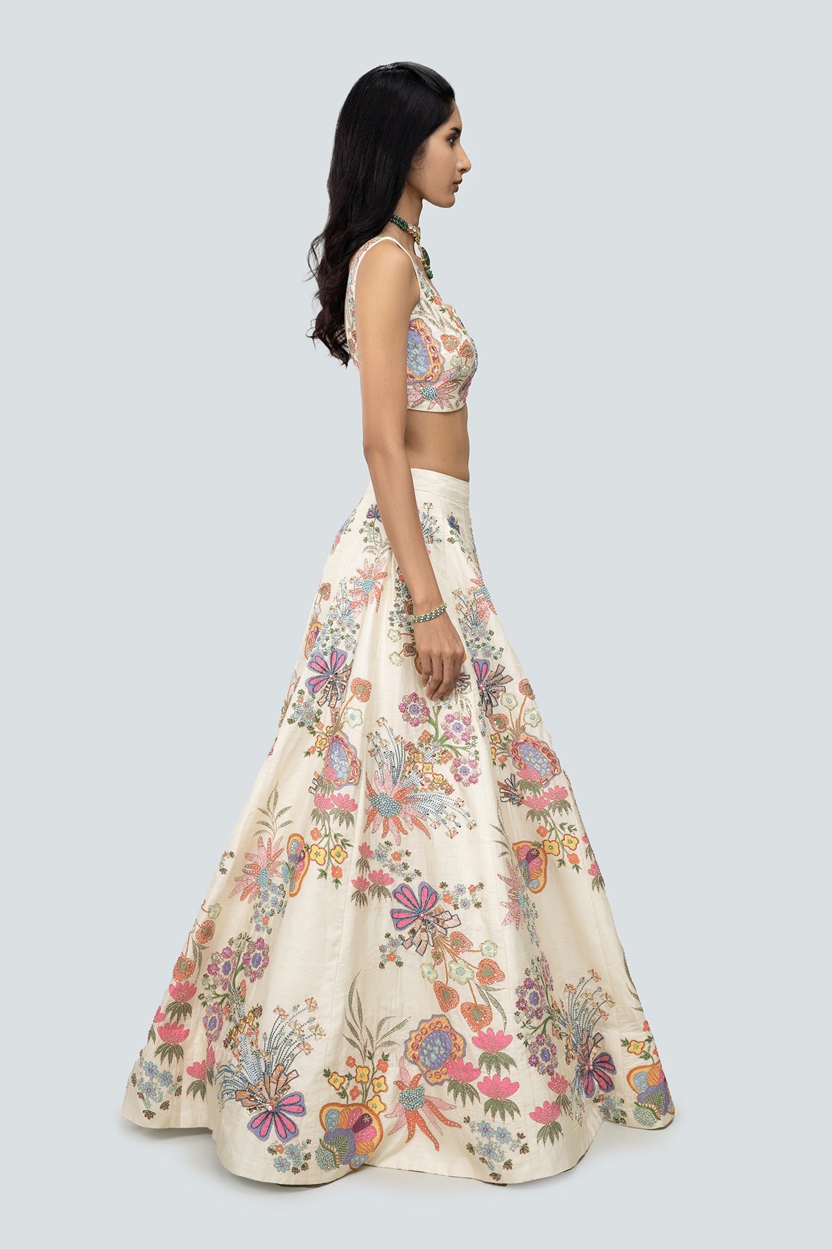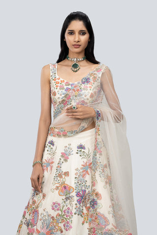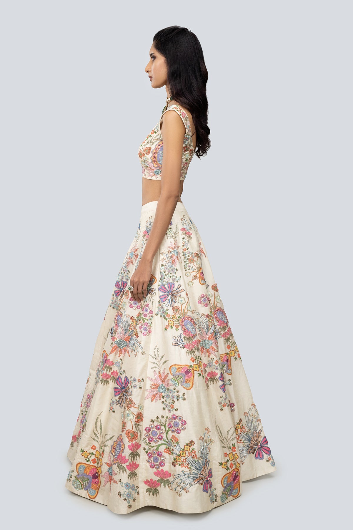 Multicolour pearl printed embellised kasab satin kali lehenga with sleeveless blouse and floral border net dupatta.