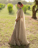 • BEIGE LEHENGA ENCRUSTED WITH CRYSTAL, BEADS AND SEQUIN AND TEAMED WITH A HANDCRAFTED, BEIGE BLOUSE FEATURING TASSEL DETAILING. THE LEHENGA IS STYLED WITH 1 TULLE DUPATTA HAVING CHROME APPLIQUE MOTIFS.