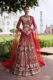 - RED LEHENGA REPLETE WITH MULTICOLORED THREADWORK EMBROIDERY ON ETHNIC MOTIFS AND SEQUINS, BEADS, AND CRYSTALS.