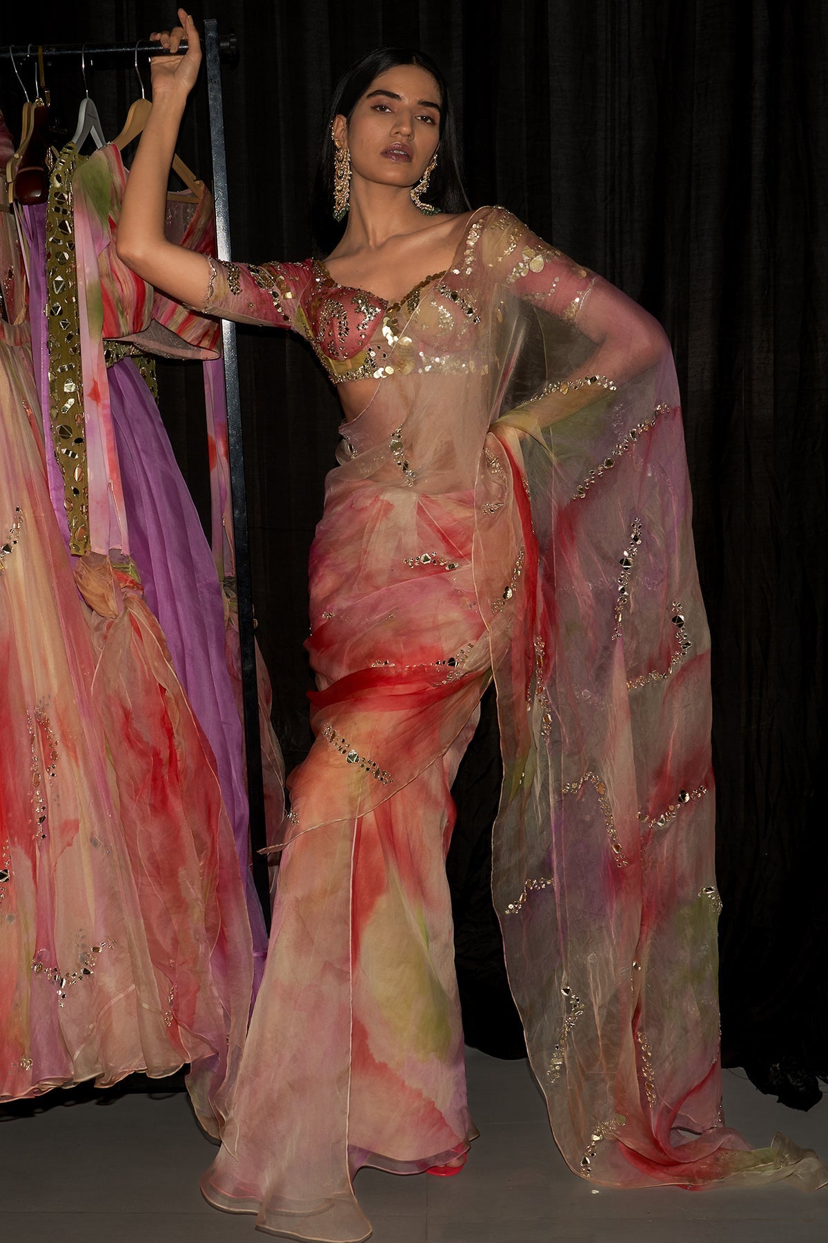 Rang Print Pre Draped Saree with Embroidered Blouse